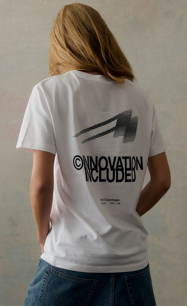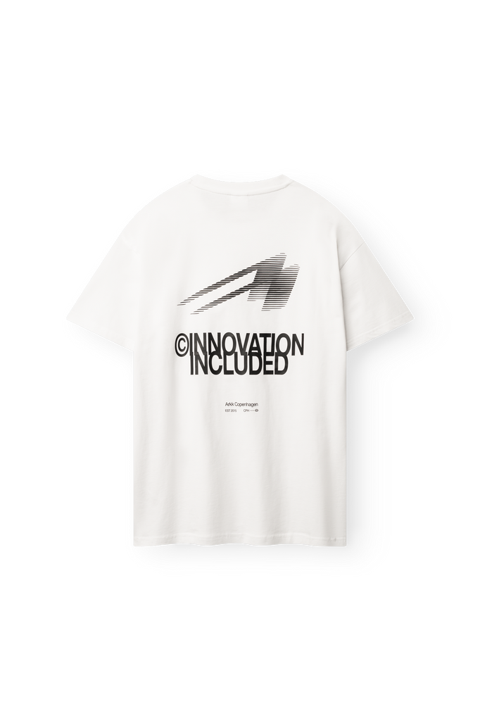 ARKK Boxy Innovation Tee – En afslappet t-shirt i boxy pasform fremstillet af 100% bomuld. Designet med et diskret logo på brystet og et markant “Innovation Included”-print på ryggen. En moderne statement-tee, der afspejler ARKK’s progressive designmindset og København-baserede DNA.