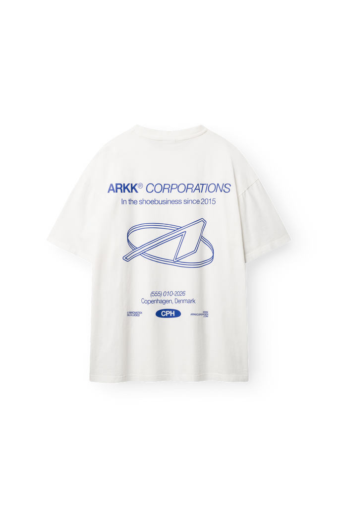 En afslappet t-shirt i boxy pasform fremstillet af 100% bomuld. Designet med et diskret logo på brystet og et markant grafisk print på ryggen, inspireret af ARKK’s rødder i København og brandets shoebusiness-arv. En statement-tee, der balancerer et minimalistisk frontudtryk med et stærkt visuelt rygprint.