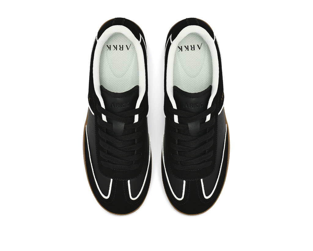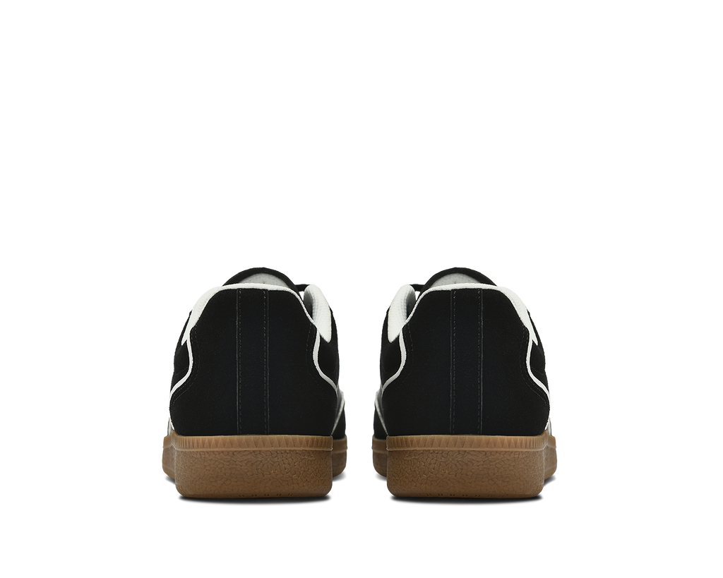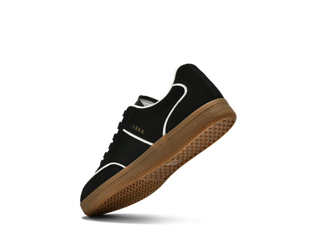 Overdelen er konstrueret med fokus på struktur og komfort, hvor materialerne tilfører både holdbarhed og et visuelt skarpt udtryk. Den lave profil og den flade sål understreger det retroinspirerede design og giver en tæt kontakt med underlaget.